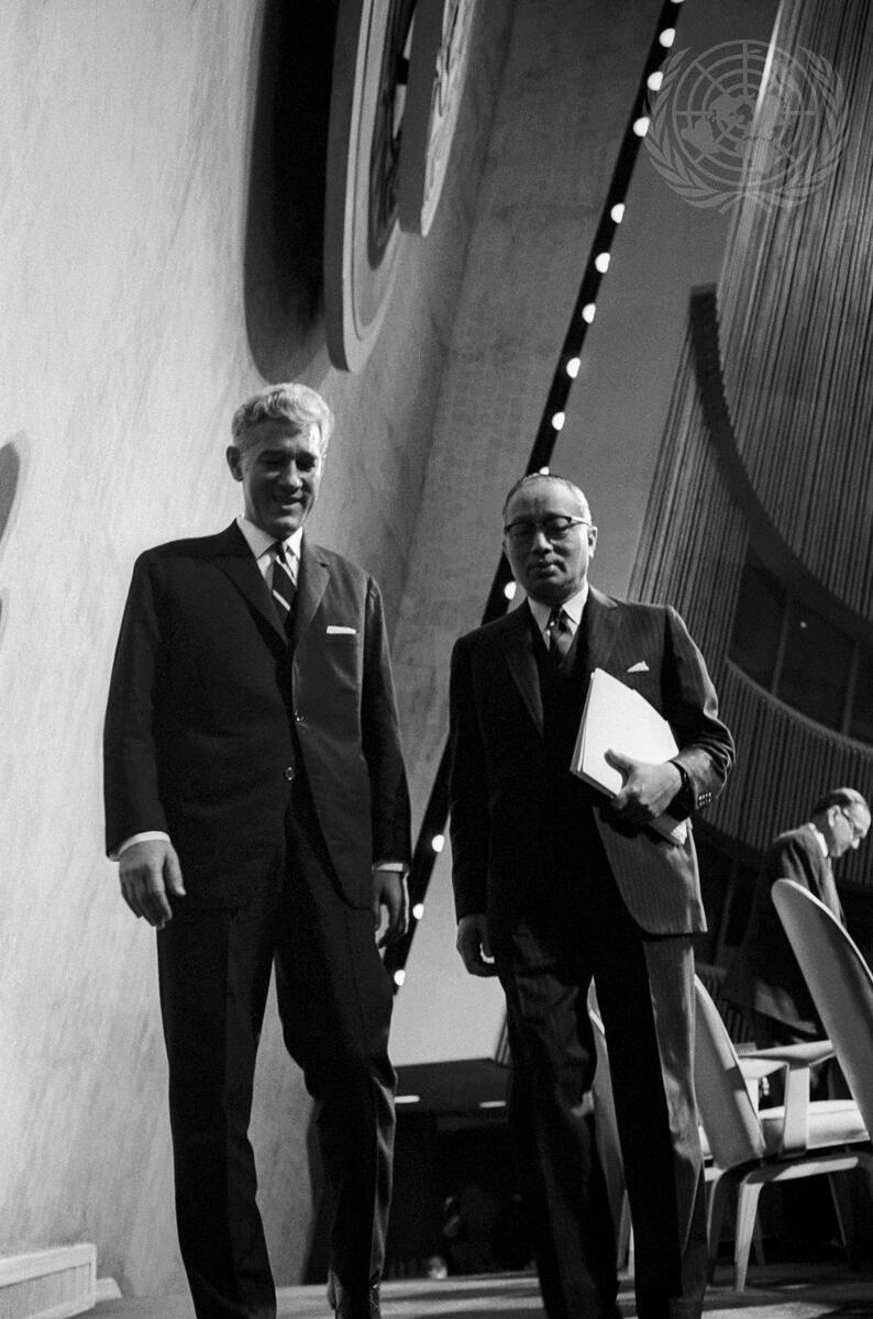President Corneliu Manescu (left) of Romania, and Secretary-General U Thant are seen leaving the podium, shortly after the session was closed.