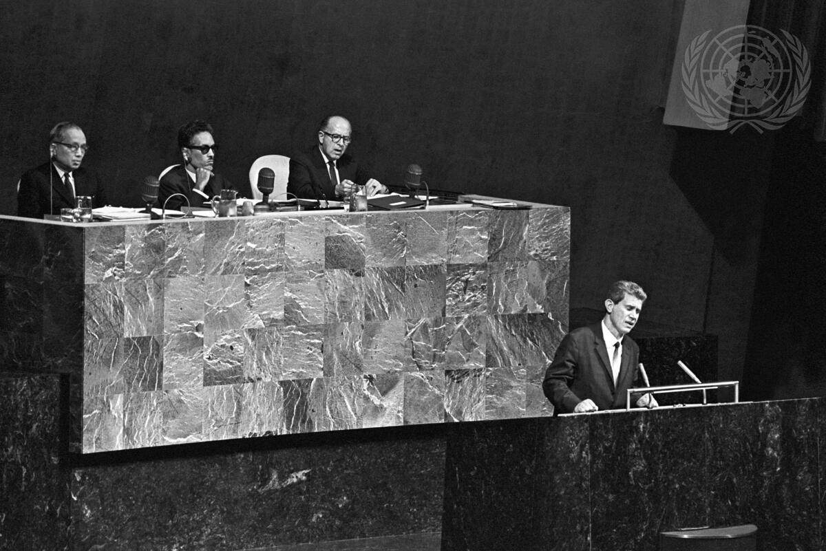 Ivan Bachev, Minister of Foreign Affairs of Bulgaria, is seen addressing the Assembly. At the presidential rostrum, from left: Secretary-General U Thant; Acting President, Abdallahi Ould Daddah (Mauritania), a Vice-President of the Assembly; and C. A. Stavropoulos, United Nations Legal Counsel.