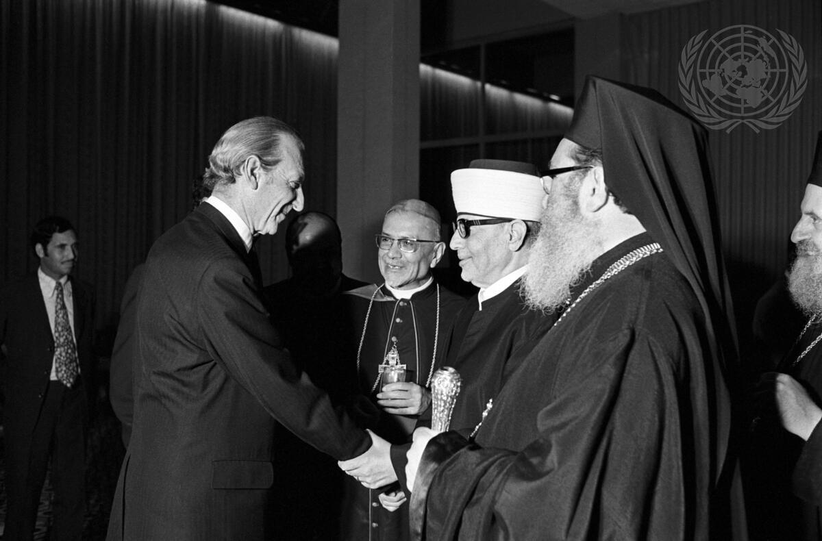 Secretary-General Kurt Waldheim conversing with Moslem and Christian religious leaders at a dinner hosted by the Minister of State for Foreign Affairs and held at King Hussein’s Sports city.