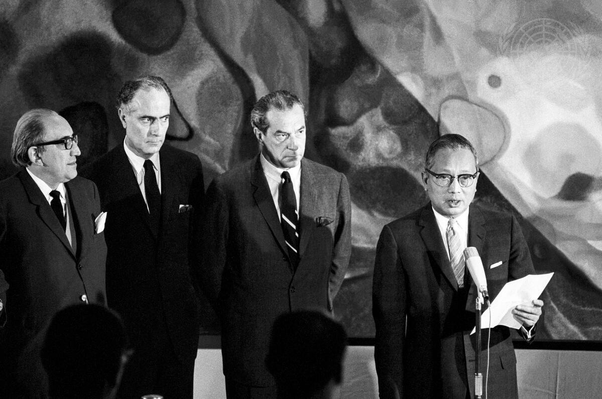 Secretary-General U Thant is seen (right) as he acknowledged the gift of the painting; to his right (right to left) are Gabriel Valdes, Chilean Foreign Minister; painter Nemesio Antunez; and Jose Pinera Carvallo, Permanent Representative of Chile to the UN.