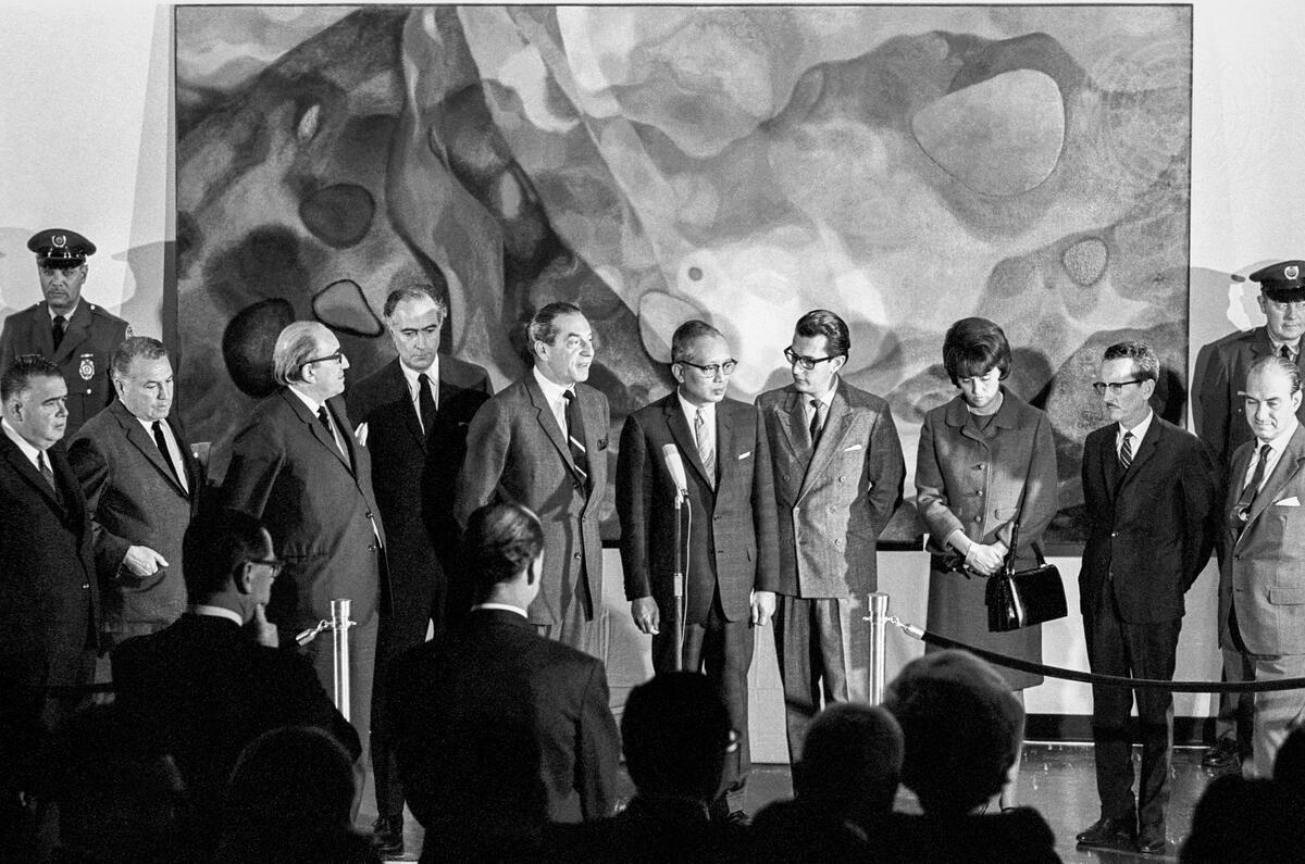 Secretary-General U THANT is seen (fifth from right) as he acknowledged the gift of the painting; to his right are Gabriel Valdes, Chilean Foreign Minister (6th from right); painter Nemesio Antunez (7th from right); and Jose Pinera Carvallo, Permanent Representative of Chile to the UN (8th from right).