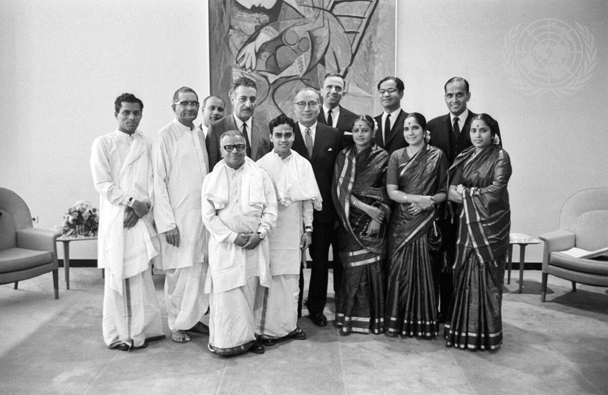 At the reception held after the recital are: Mme. Subbulakshmi (second from right, front row); Secretary-General U Thant (centre); Abdul Rahman Pazhwak (Afgahanistan), President of the 21st session of the General Assembly (third from left, second row); G. Parthasarathi (India), Ambassador and Permanent Representative to the UN (second from right, second row); and C.V. Narasimhan, Under-Secretary for General Assembly Affairs and Chef de cabinet (right, second row).
