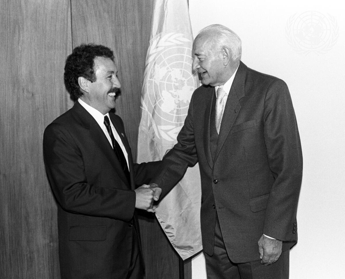 President of the Republic of Guatemala, Marco Vinicio Cerezo-Arevalo (left), greets General Assembly President Peter florin, shortly before the Guatemala leader was scheduled to address the morning session of the General Assembly.