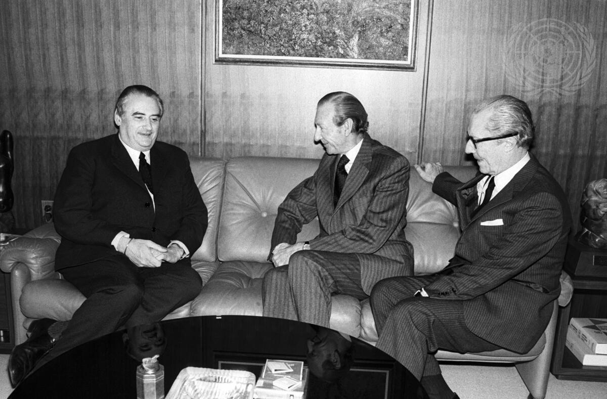 Xavier Deniau (left), Vice-President of the Commission of Foreign Affairs in the National Assembly of France, is seen as he paid a courtesy call on Secretary-General Kurt Waldheim, during his visit to United Nations Headquarters today. At right is Ambassador Louis de Guiringaud, Permanent Representative of France to the UN.