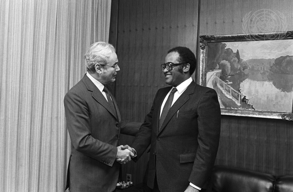 Secretary-General Javier Perez de Cuellar today conferred at United Nations Headquarters with the Minister for Foreign Affairs of the United Republic of Tanzania, Salim Ahmed Salim (right), who is here to attend the 37th regular session of the General Assembly.