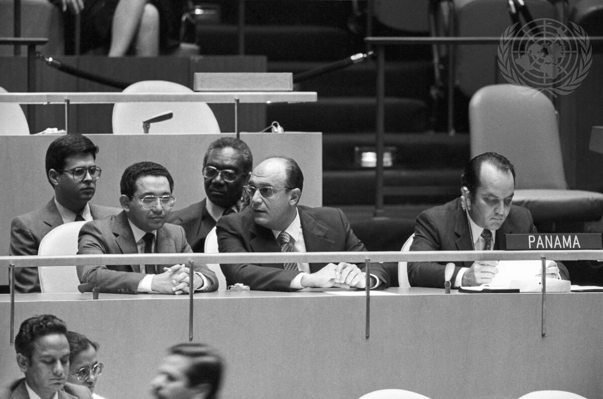 The delegation of Panama headed by the Minister for Foreign Affairs, Juan Jose Amado III (right), listening to their Vice-President’s address to the General Assembly on 5 October.