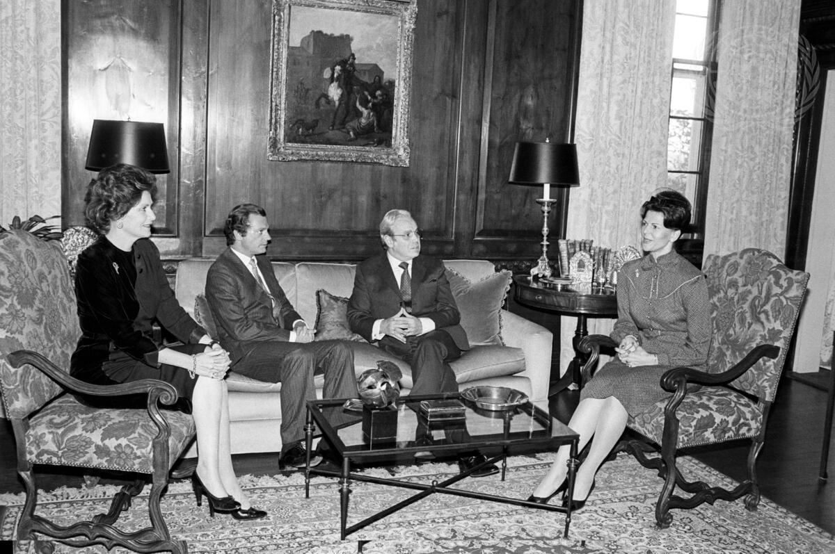 King Carl XVI Gustaf of Sweden and Queen Silvia of Sweden paid an official visit to United Nations Headquarters. The King and Queen later attended a luncheon given their honour by the Secretary-General Javier Perez de Cuellar (second from right) and Mrs. Perez de Cuellar (left).