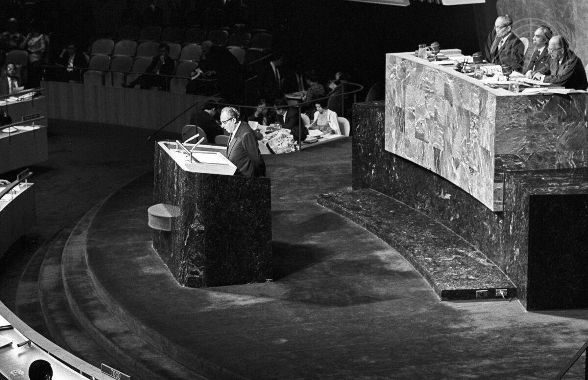 Nesti Nase, Foreign Minister of Albania, addressing the Assembly. At the presidential rostrum, from left: Secretary-General U Thant; Assembly President Adam Malik (Indonesia); and C.A. Stavropoulos, Under-Secretary-General for General Assembly Affairs.