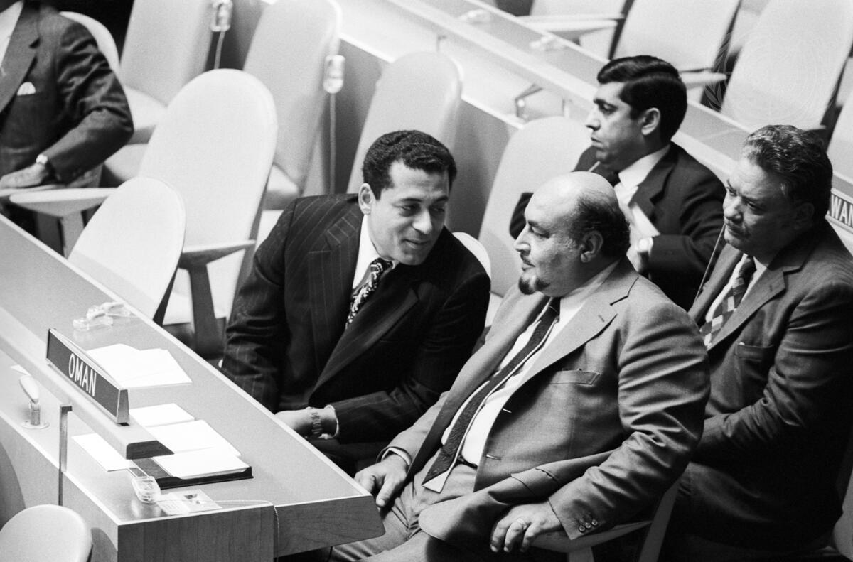 Seen here is the delegation of Oman headed by Said Tarik El Said (right, behind nameplate), Prime Minister and Minister for Foreign Affairs of Oman. Seated next to him is Asim Al Jamali, Minister of Health. Seated behind them are Omar Baruni (right) and Ahmed Macki.