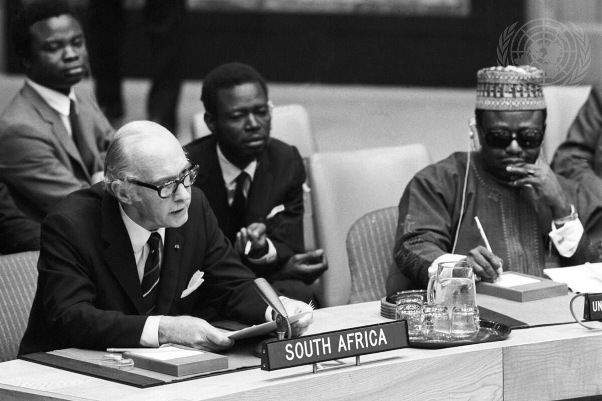 Hilgard Muller (left), Foreign Minister of South Africa, addresses the Council, as Salim Ahmed Salim of the United Republic of Tanzania looks on.