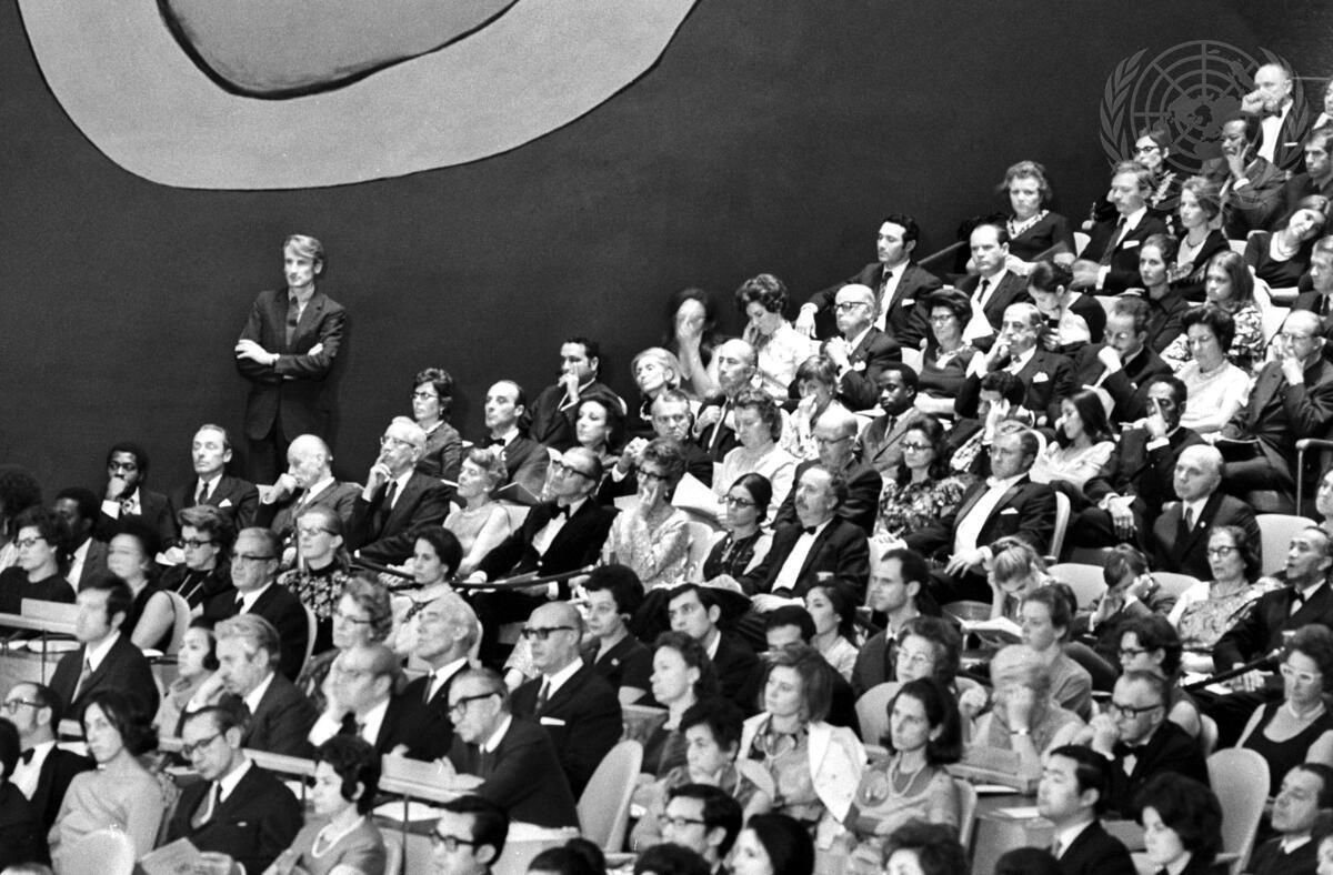 Caption Description The 1970 United Nations Day Concert was held in the General Assembly Hall at United Nations Headquarters tonight. Cosmogony, a new composition for soloists, chorus and orchestra by the Polish composer Krzysztof Penderecki, which was commissioned by UN Secretary-General, U Thant, to mark the twenty-fifth anniversary of the United Nations, was performed by the Los Angeles Philharmonic Orchestra, with the Rutgers University Chore and soloists, under the direction of Zubin Mehta.