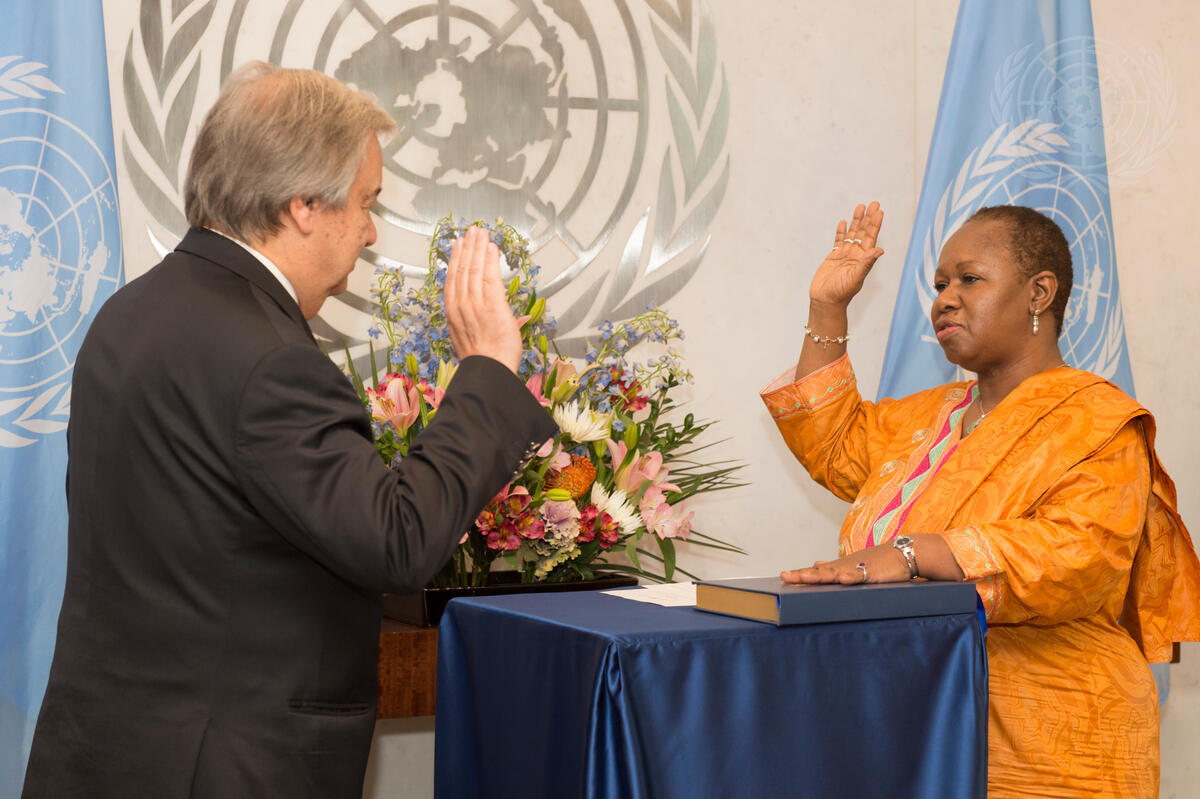 Secretary-General António Guterres (left) swears in Bintou Keita as Assistant Secretary-General for Peacekeeping Operations.
