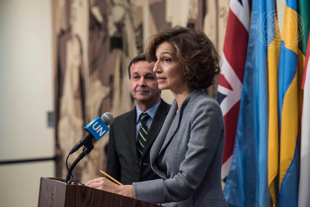 Audrey Azoulay (right), Director-General of the United Nations Educational, Scientificand Cultural Organization (UNESCO), briefs journalists following a Security Council meeting on the maintenance of international peace and security, specifically destruction and trafficking of cultural heritage by terrorist groups and in situations of armed conflict.