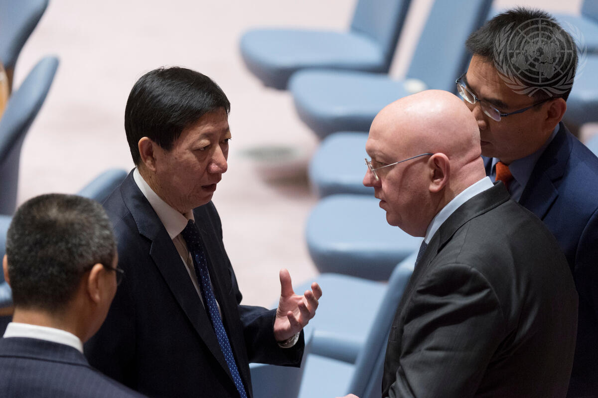 Vassily Alekseevich Nebenzia (right), Permanent Representative of the Russian Federation to the UN, and Wu Haitao, Deputy Permanent Representative of the People’s Republic of China, speak prior to the Security Council meeting on the latest launch of the ballistic missile by the Democratic People's Republic of Korea (DPRK).