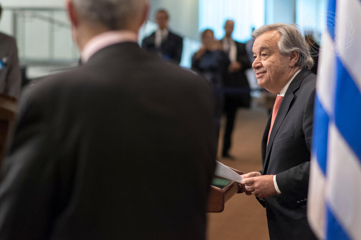 Secretary-General António Guterres (right) reads a statement to the media on the Middle East peace process.