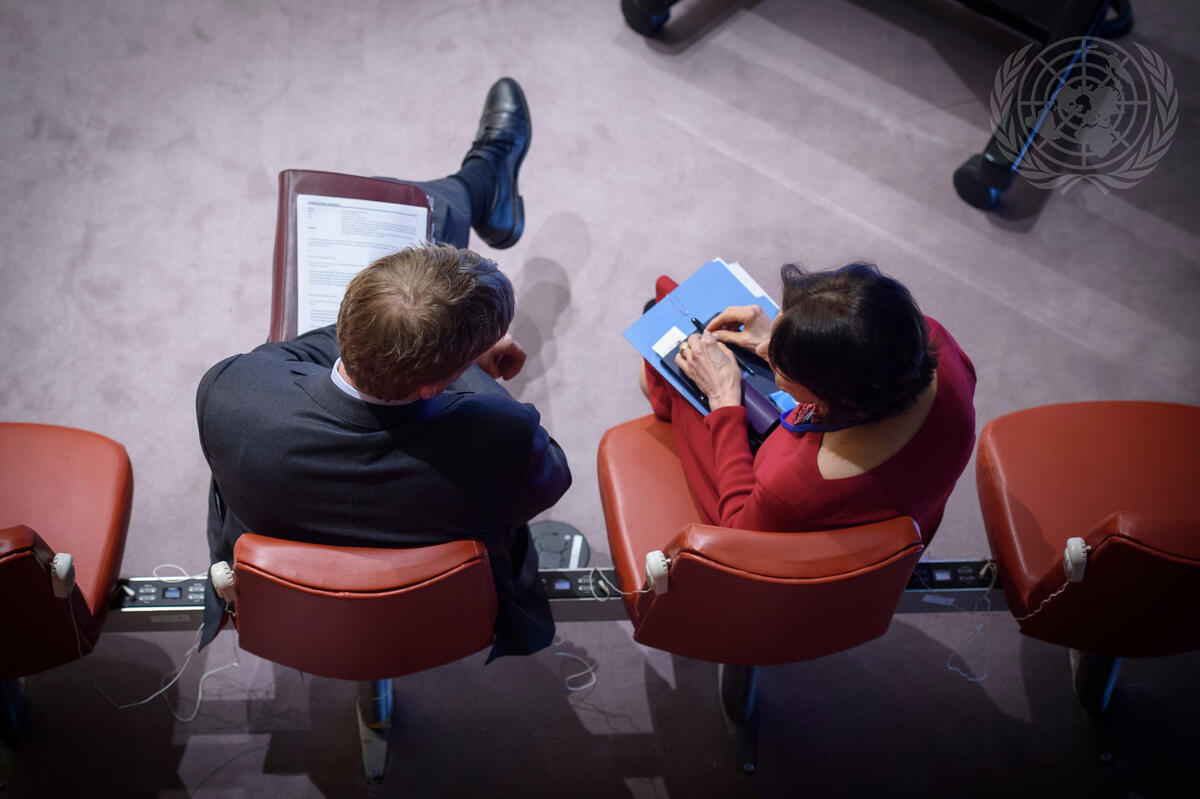 Rosemary A. DiCarlo (right), Under-Secretary-General for Political Affairs, speaks with Jonathan Allen, Deputy Permanent Representative of the United Kingdom during the Security Council on the situation in the Middle East, including the Palestinian question.