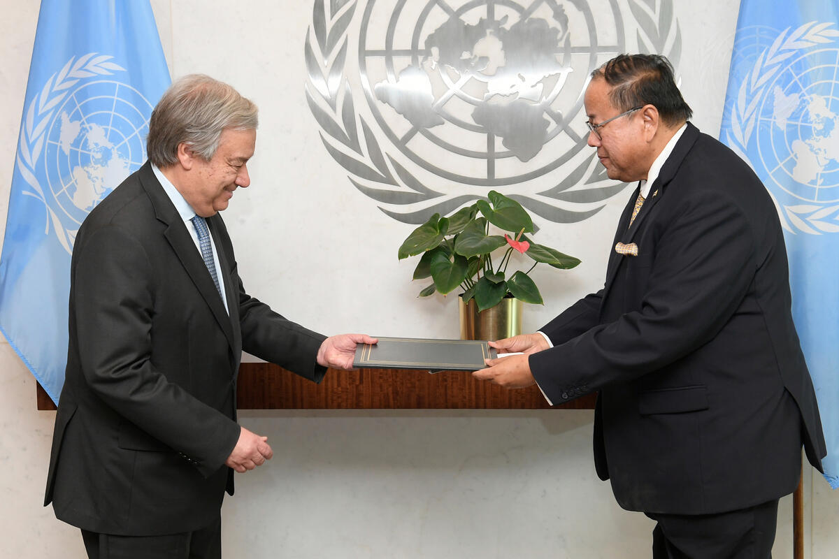 Vitavas Srivihok (right), new Permanent Representative of the Kingdom of Thailand to the UN, presents his credentials to Secretary-General António Guterres.