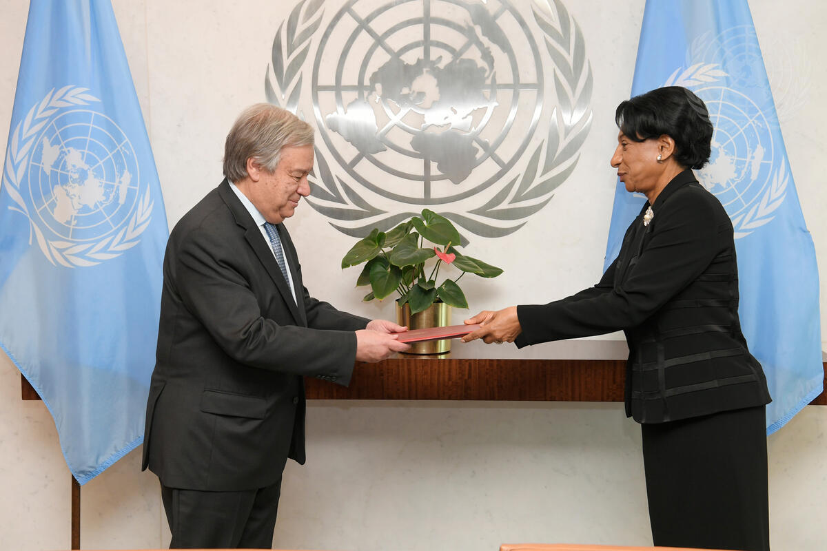 Maria de Jesus dos Reis Ferreira (right), new Permanent Representative of the Republic of Angola to the UN, presents her credentials to Secretary-General António Guterres.