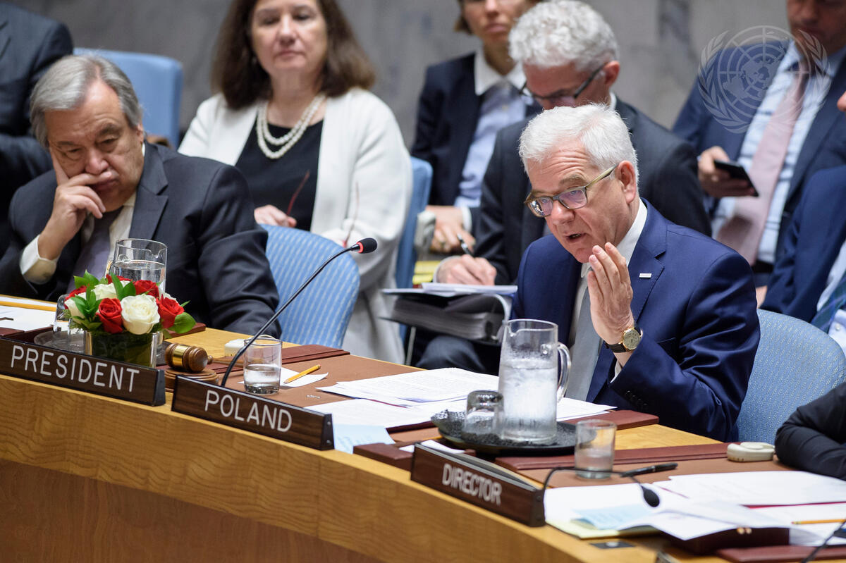 Jacek Czaputowicz (right), Minister for Foreign Affairs of Poland and President of the Security Council for the month of May, addresses the Security Council in his national capacity on the protection of civilians in armed conflict.