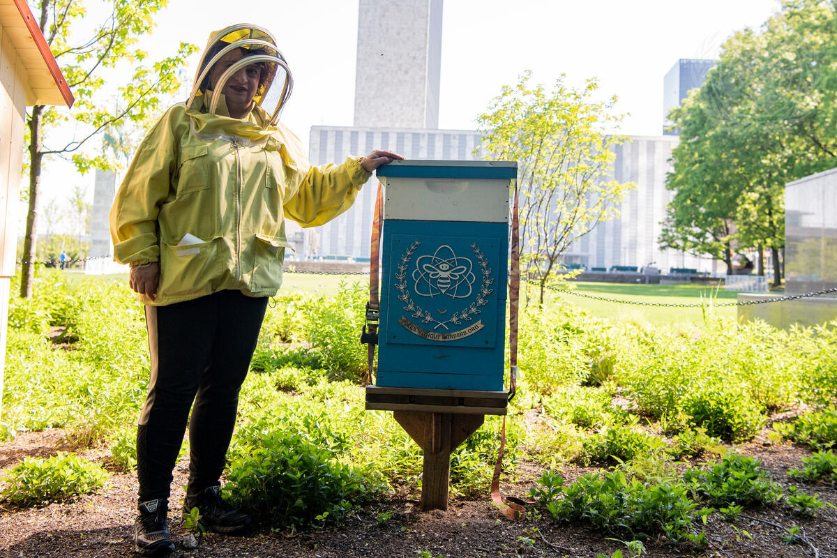 A beekeeper poses with one of the houses donated by Bees Without Borders in 2017, when the hive was first introduced to UNHQ.