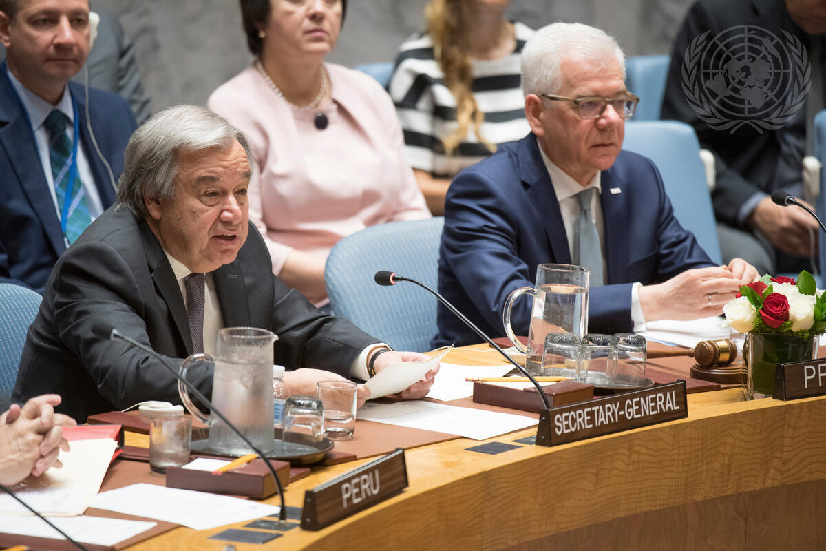 Secretary-General António Guterres (left) addresses the Security Council meeting on the protection of civilians in armed conflict.