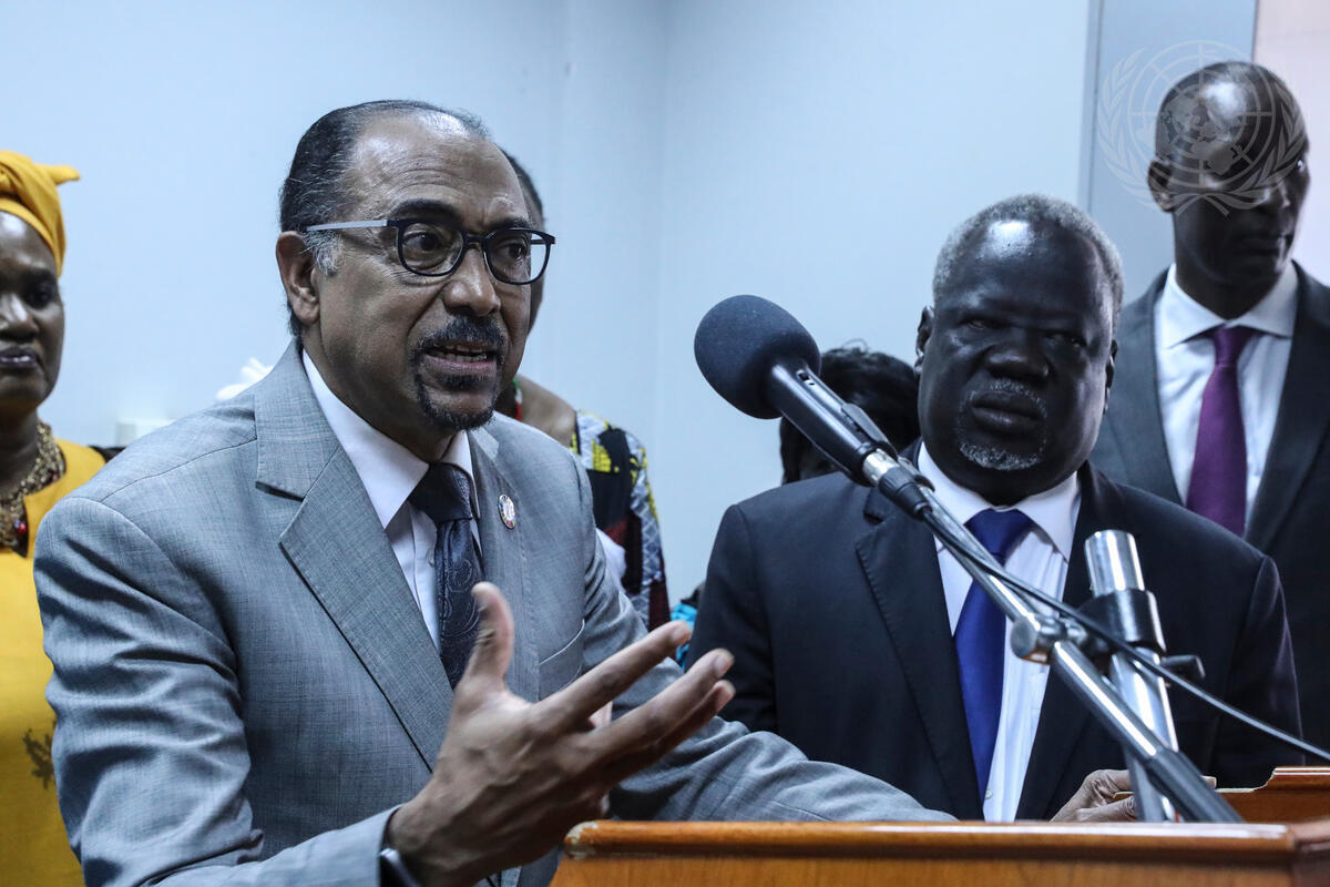 Michel Sidibé (left), Executive Director of the Joint United Nations Programme on HIV and AIDS (UNAIDS) briefs press together with Riek Gai Kok (right), Minister of Health of the Republic of South Sudan, as the South Sudan National Ministry of Health signs a memorandum of understanding (MoU) with UNAIDS, on the right to health in the education sector. The commitment will see the incorporation of sexual education in the school curriculum to create awareness among young people to guard against HIV and other sexually transmitted infections.
