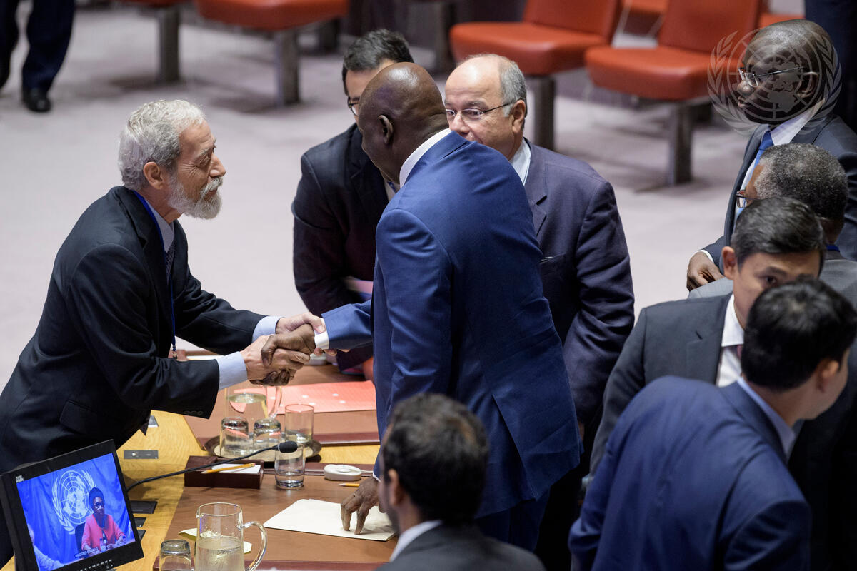 José Viegas Filho (left), Special Representative of the Secretary-General and Head of the United Nations Integrated Peacebuilding Office in Guinea-Bissau, greets Aristides Gomes, Prime Minister of Guinea-Bissau, at the end of the Security Council meeting on the situation in Guinea-Bissau. By their side is Mauro Vieira, Chair of the Guinea-Bissau Configuration of the Peacebuilding Commission and Permanent Representative of Brazil to the UN.