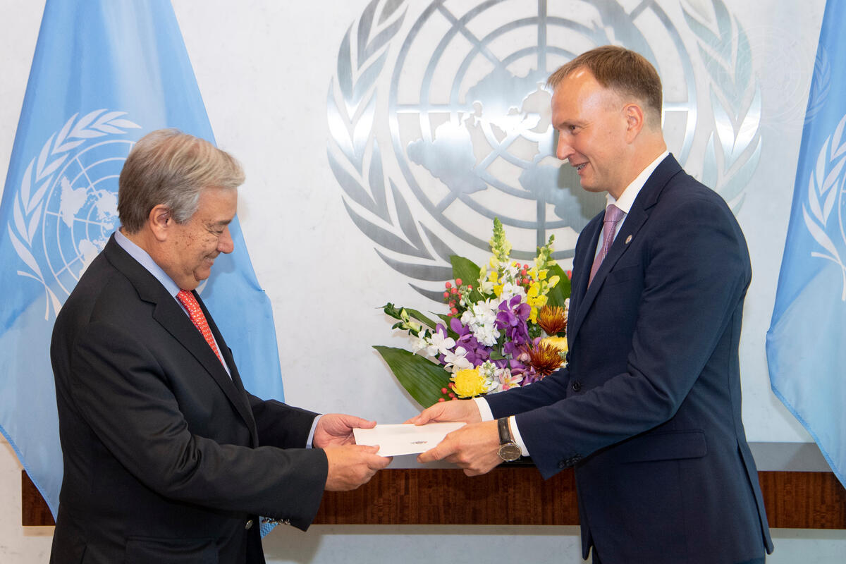 Andrejs Pildegovics (right), new Permanent Representative of the Republic of Latvia to the United Nations, presents his credentials to Secretary-General António Guterres.