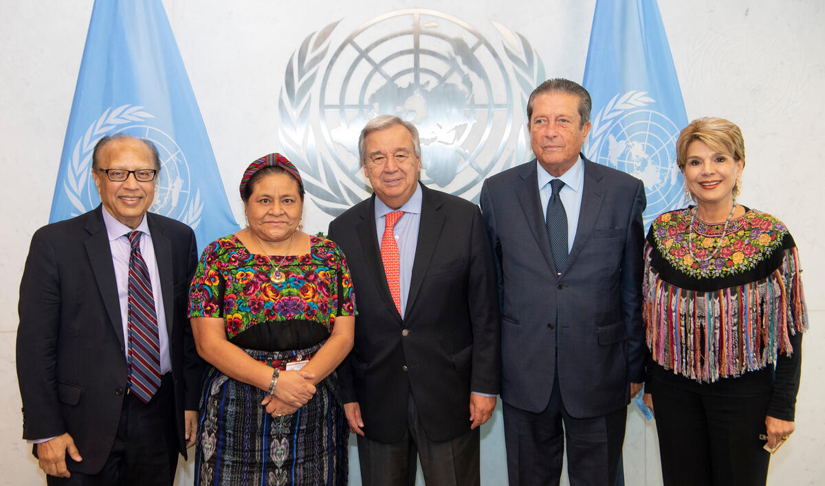 Secretary-General António Guterres (centre), meets with Federico Mayor Zaragoza (second from right), President of the Foundation for a Culture of Peace. Left to right: Anwarul Chowdhury, Former Under-Secretary-General for the Least Developed Countries, Landlocked Developing Countries and Small Island Developing States and Key Organizer of the High-level Forum on the Culture of Peace; Rigoberta Menchú, Guatemalan indigenous leader, human rights activist and Nobel Laureate; Mr. Guterres; Mr. Zaragoza; Anaisabel Prera,
