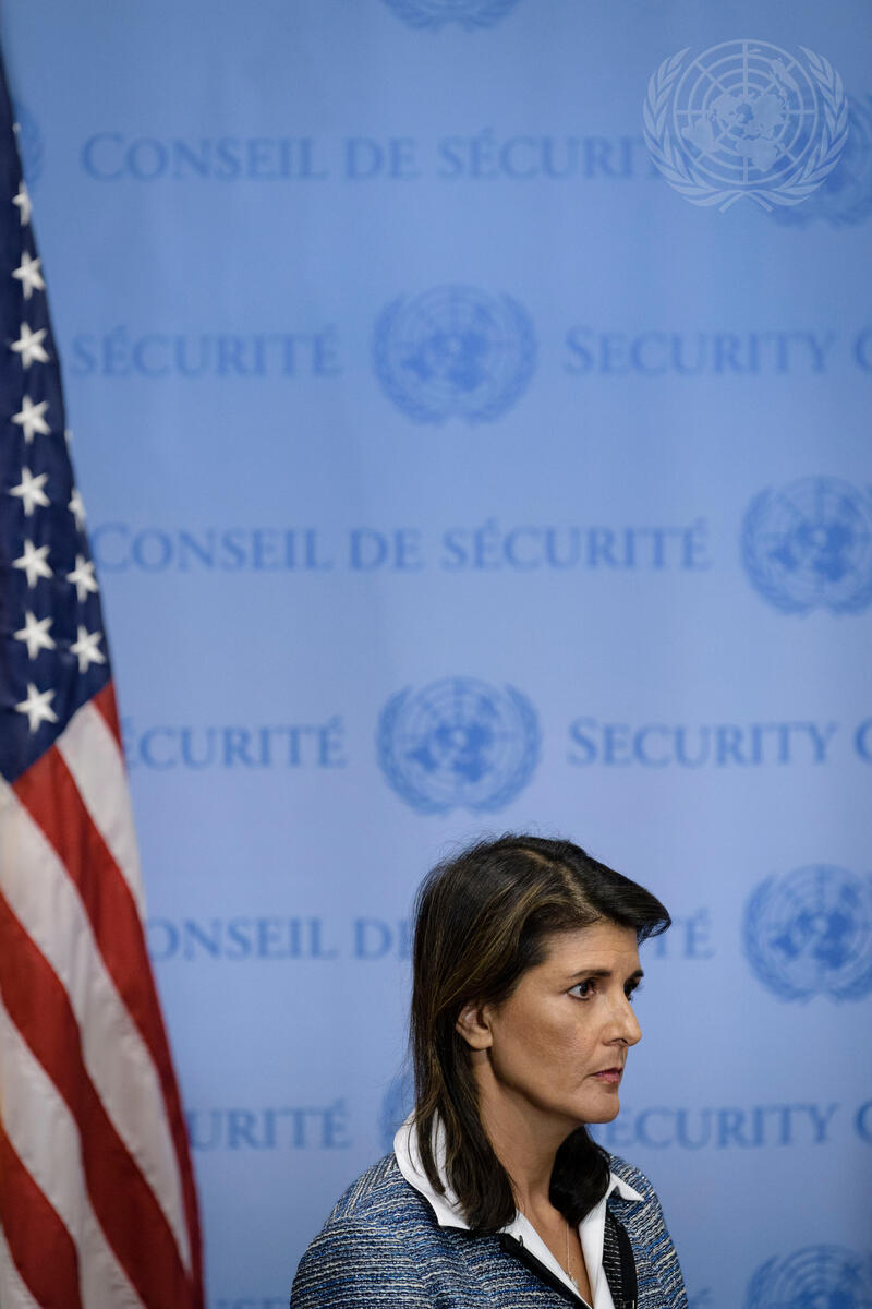 Nikki R. Haley, Permanent Representative of the United States to the UN and President of the Security Council for the month of September, seen before briefing press after the Security Council meeting on the situation in Nicaragua.