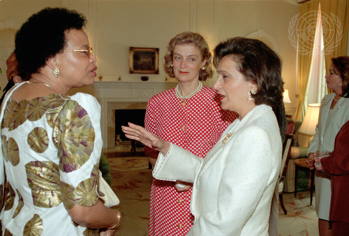 Egyptian First Lady Suzanne Mubarak converses with Graca Machel (left), First Lady of South Africa, as Nane Annan looks on. They were at a luncheon hosted by Mrs. Annan for them and for Danielle Mitterrand, the former First Lady of France.
