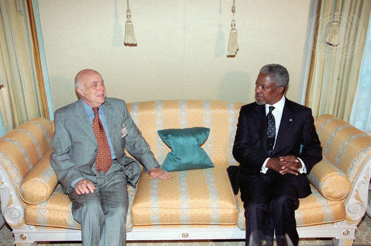 Kofi Annan, Secretary-General of the United Nations, meets with Azeddine Laraki, Secretary-General of the Organization of the Islamic Conference, at the Al-Mushref Palace.