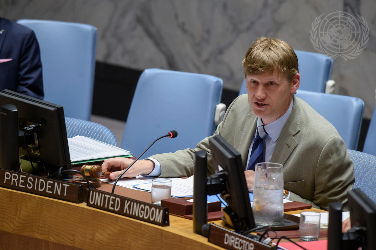 Jonathan Guy Allen, Deputy Permanent Representative of the United Kingdom and President of the Security Council for the month of August, chairs the Security Council meeting on the consideration of the draft report of the Security Council to the General Assembly.