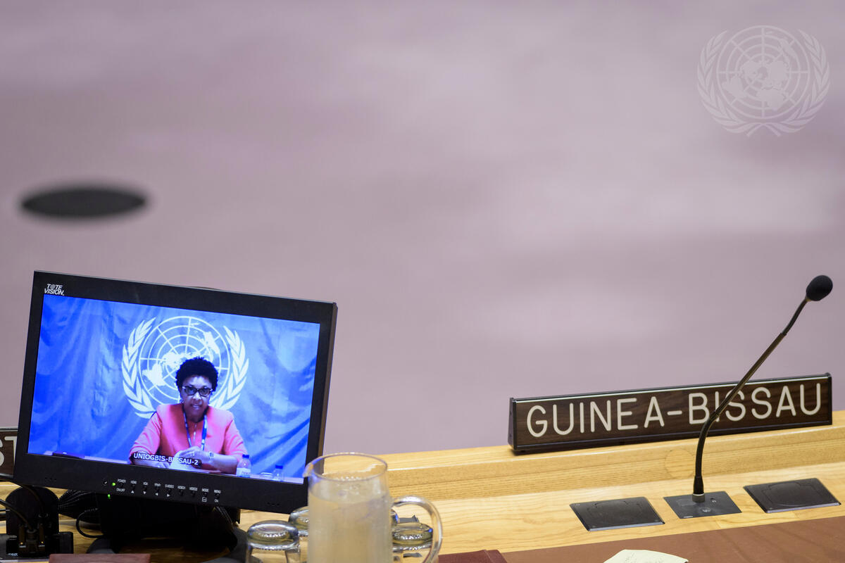 Elisa Maria Tavares Pinto (on screen) of the Economic Community of West African States (ECOWAS) Women, Peace and Security Network, addresses the Security Council meeting on the situation in Guinea-Bissau.