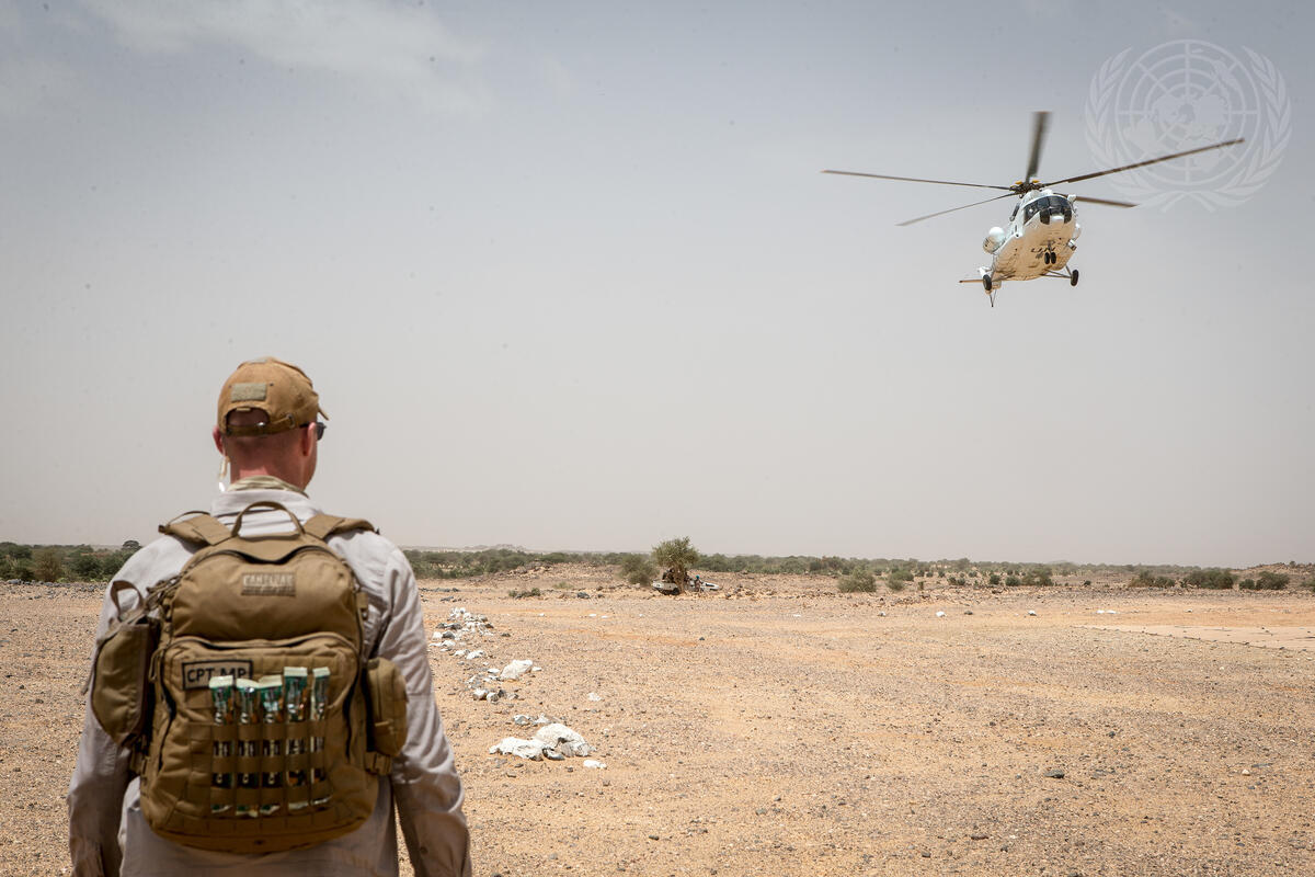 A security officer observes the arrival of the helicopter that brings Jean-Pierre Lacroix, Under-Secretary-General for Peacekeeping Operations, to visit the town of Aguelhok, northern Mali.