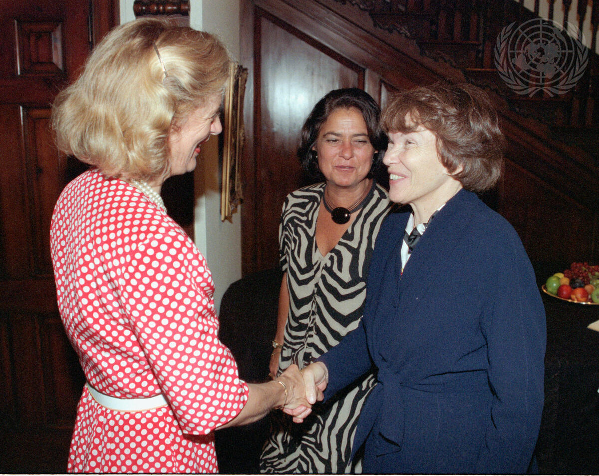 Nane Annan (left) greets Danielle Mitterrand, former First Lady of France. She was hosting a luncheon in honour of Mrs. Mitterrand, Egyptian First Lady, Suzanne Mubarak, and Graca Machel, the First Lady of South Africa.