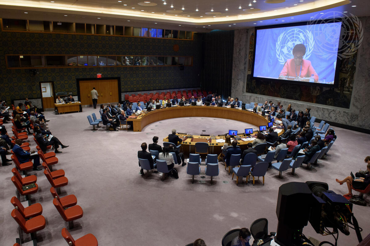 Wide view of the Security Council as Elisa Maria Tavares Pinto (on screen) of the Economic Community of West African States (ECOWAS) Women, Peace and Security Network, addresses the Council meeting on the situation in Guinea-Bissau.
