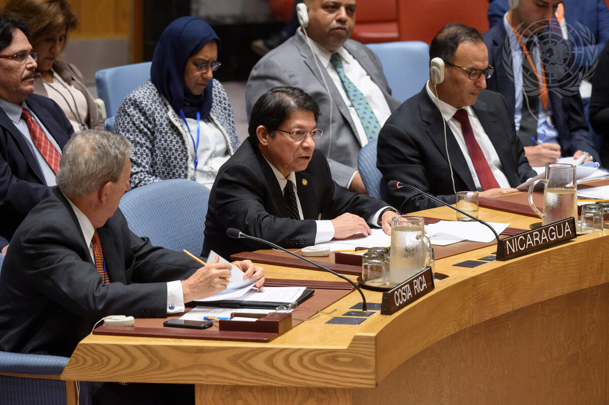 Denis Ronaldo Moncada Colindres (centre), Minister for Foreign Affairs of the Republic of Nicaragua, addresses the Security Council meeting on the situation in his country.