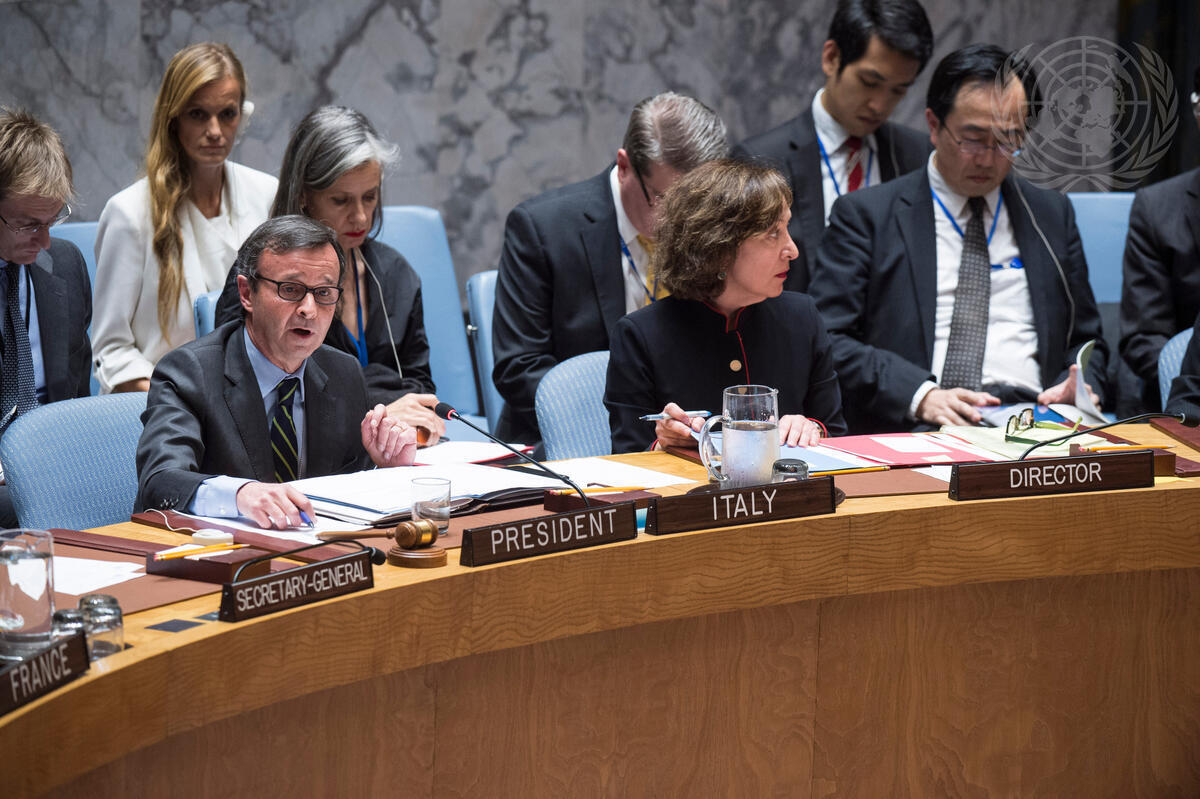 Sebastiano Cardi (front left), Permanent Representative of Italy to the UN and President of the Security Council for November, chairs the meeting.