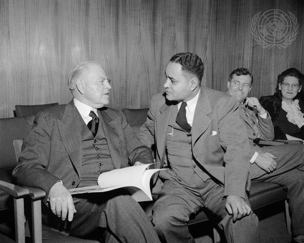 Warren R. Austin, Permanent Representative of the United States to the United Nations (left), talks with Ralph Bunche, Director of the United Nations Trusteeship Division and Secretary to the United Nations Special Committee on Palestine, before the Security Council at which the new United States plan on Palestine was submitted.