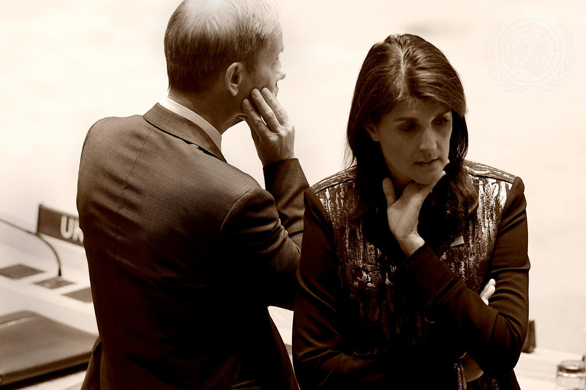Nikki Haley (right), United States Permanent Representative to the UN, with Olof Skoog, Permanent Representative of Sweden, in the Council Chamber.