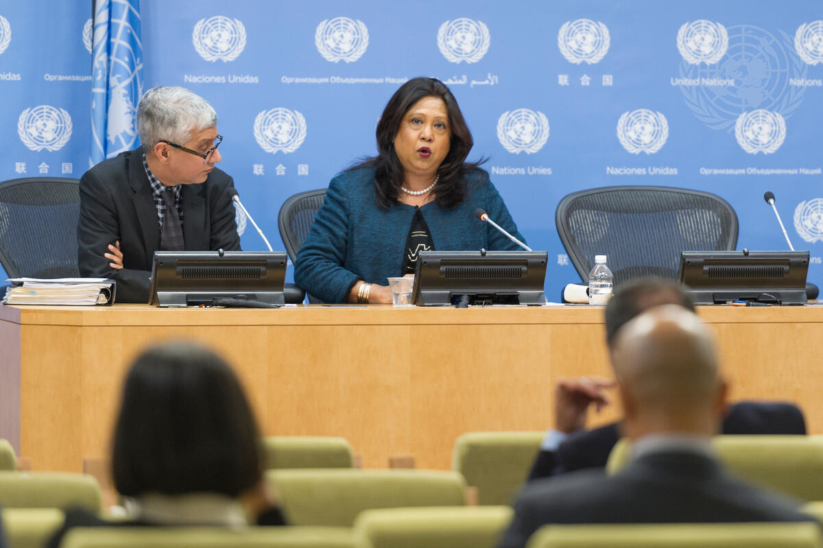 Pramila Patten (centre), Special Representative of the Secretary-General on Sexual Violence in Conflict, briefs journalists. At left is Farhan Haq, Deputy Spokesperson for the Secretary-General.
