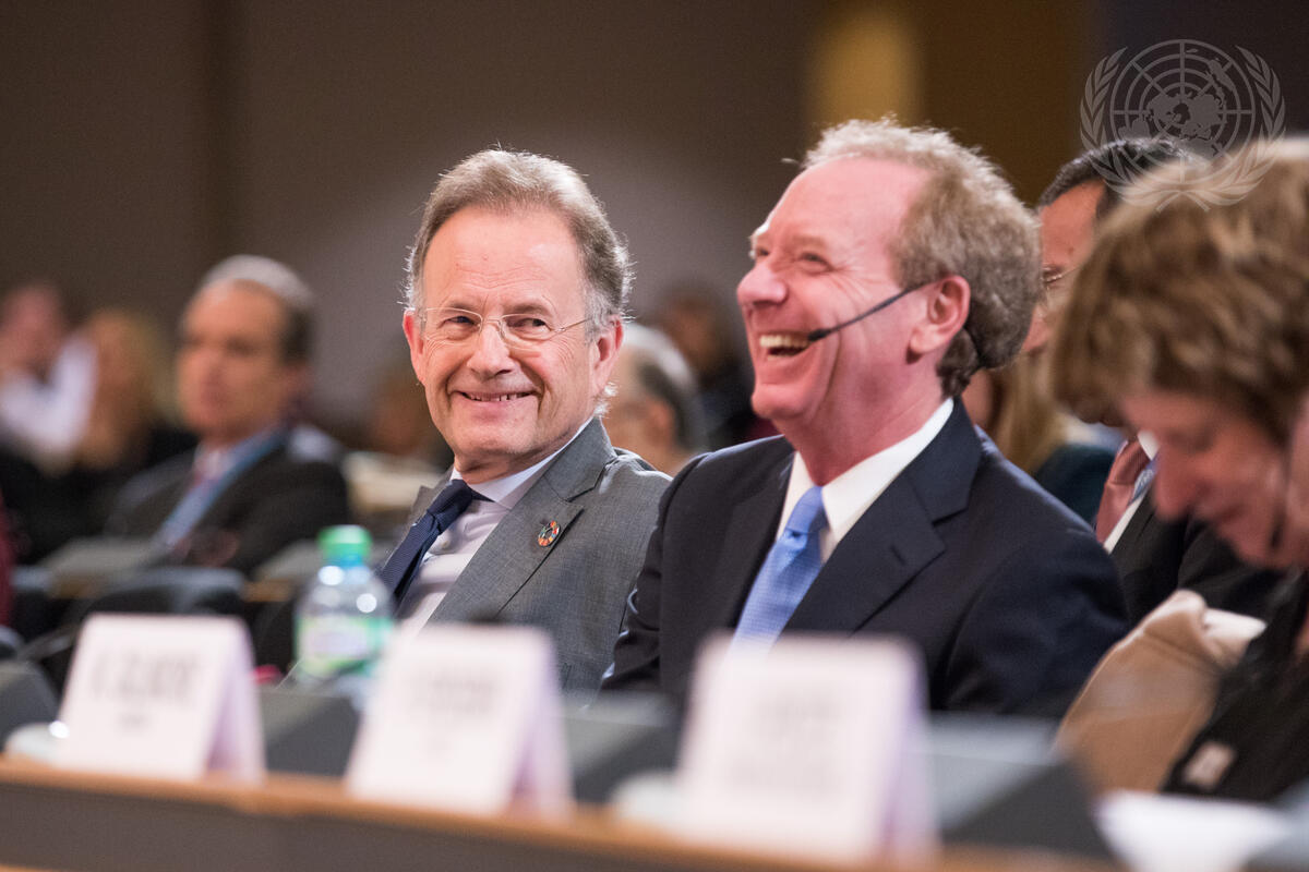 Michael Møller (centre left), Director-General of United Nations Office at Geneva (UNOG), and Brad Smith (centre right), President and Chief Legal Officer of Microsoft, at the Geneva Lecture Series 2017, held on the theme ""Current Internet Governance Challenges: what’s next?"".