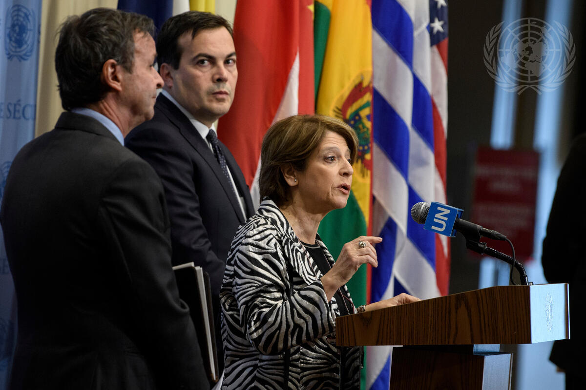 Maria Grazia Giammarinaro, UN Special Rapporteur on trafficking in persons, especially in women and children, briefs journalists at the stakeout area during the Security Council's open debate on trafficking in persons in conflict situations.