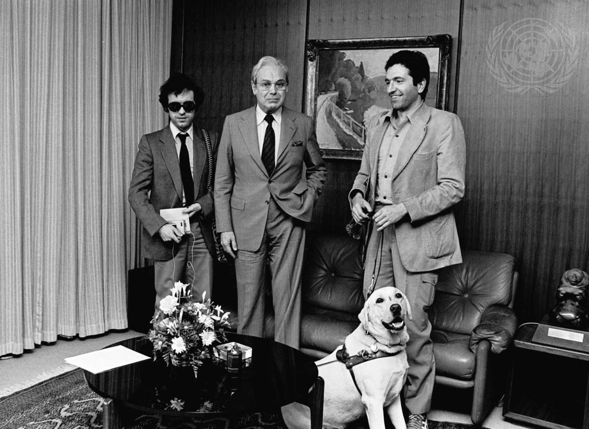 Javier Perez de Cuellar, Secretary-General of the United Nations (centre), during a meeting with Roberto Martin Sanchez, a blind reporter for Madrid's Radio Cadena Espanola, accompanied by Francisco Grande of the National Federation for the Blind, and Basen, a seeing-eye dog.