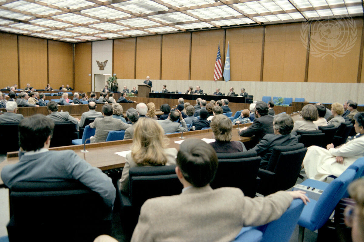During his visit to Washington, D.C., Javier Perez de Cuellar, Secretary-General of the United Nations, addresses the staff of the Bureau of International Organization Affairs, at the State Department's Loy Henderson auditorium.