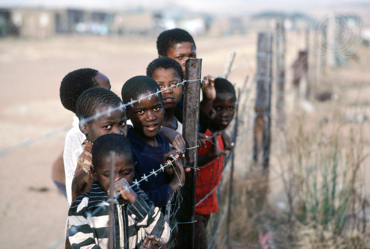 Children of Ekuvukene, which is a ""resettlement"" village in Kwazulu ""homeland"", Natal. Millions of black South Africans have been forcibly resettled in such villages called black ""homelands"" since 1948, the largest force movement of people in peacetime history.