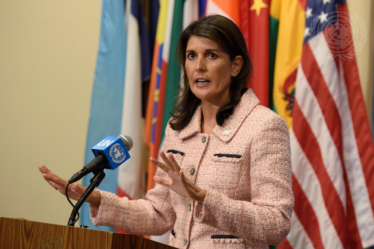 Nikki R. Haley, Permanent Representative of the United States to the UN and President of the Security Council for the month of September, briefs press following Security Council consultations on the situation in the Middle East (Yemen).
