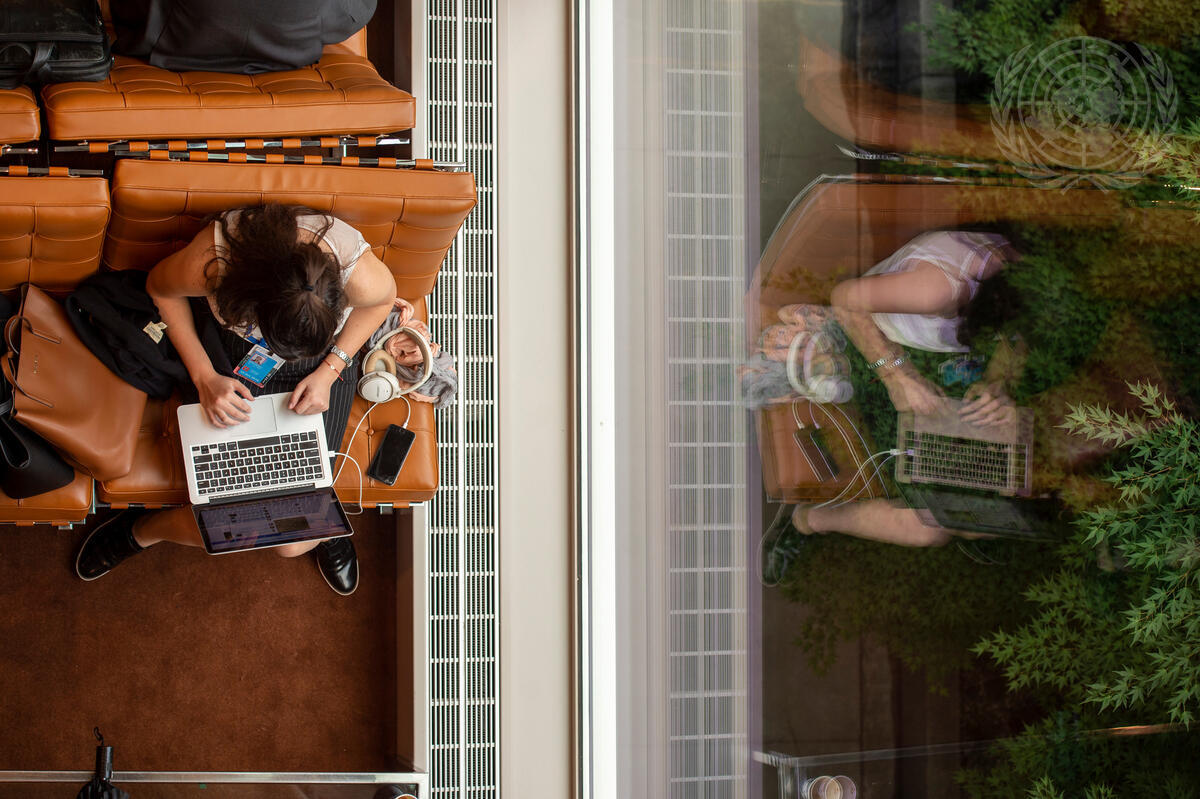 A delegate works on her laptop in the UN Secretariat Lounge on the fourth day of the General Assembly's seventy-third general debate.
