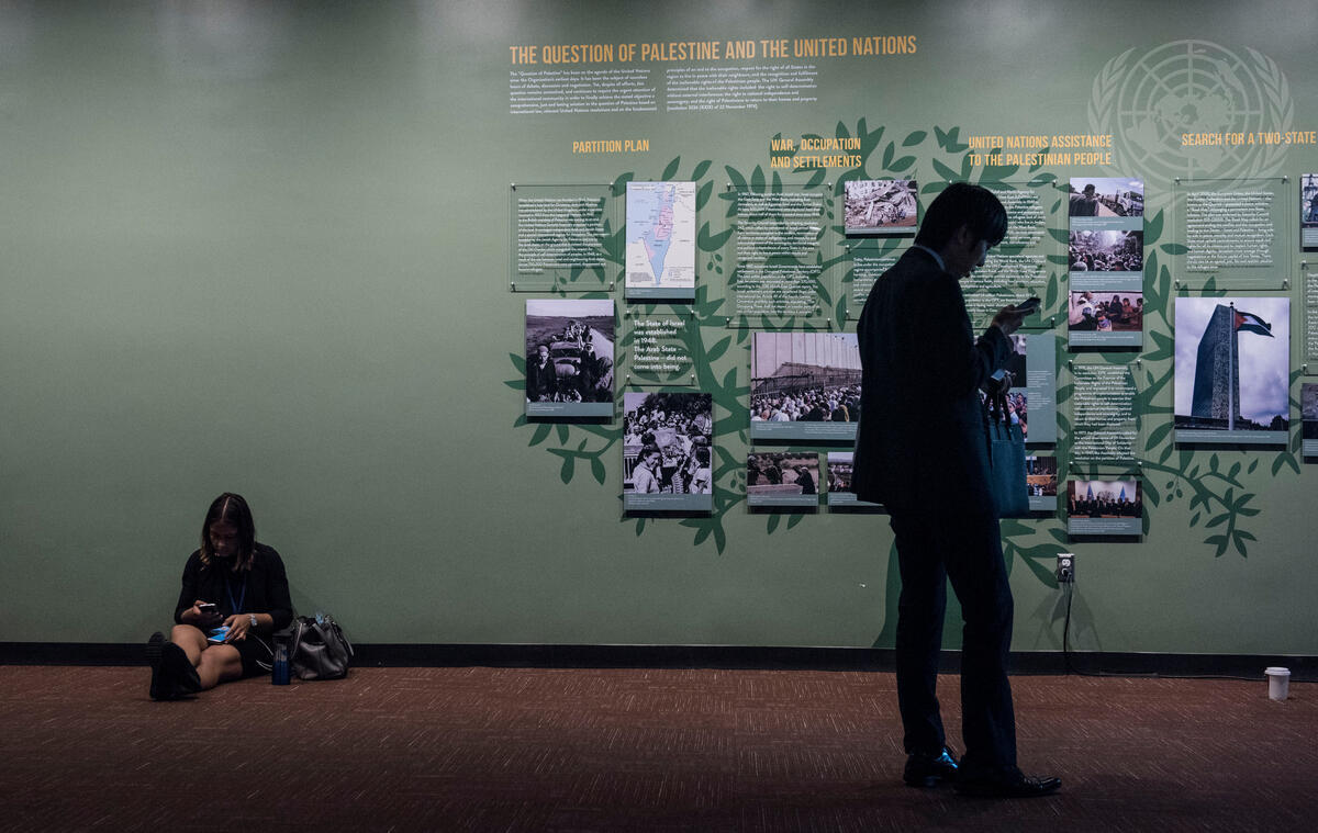 Two participants of events at UN Headquarters check their phones in the hall of the Conference building on the third day of the General Assembly's seventy-third general debate.